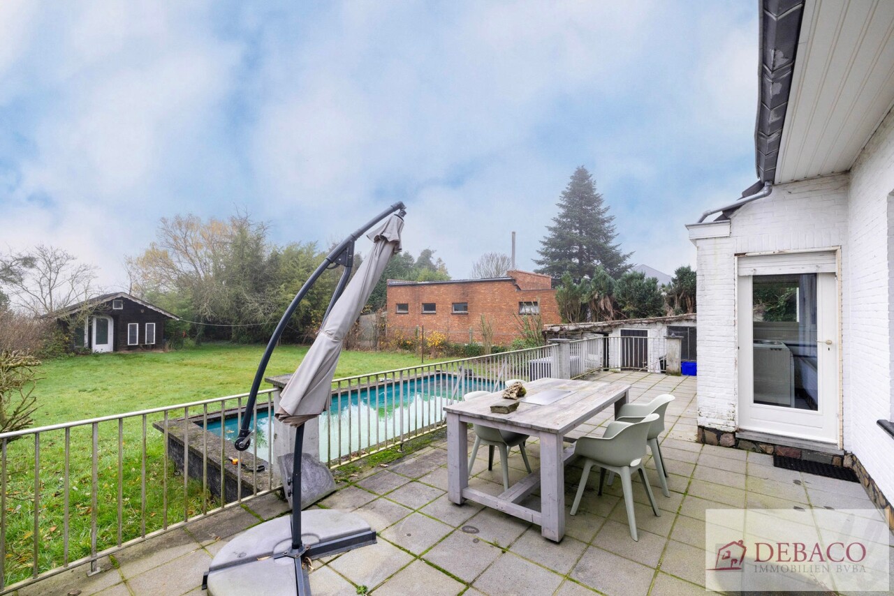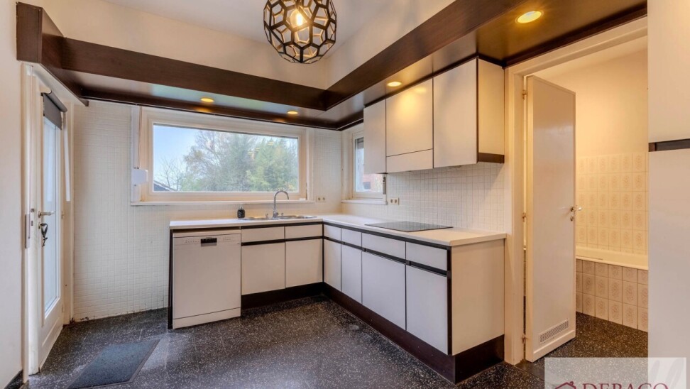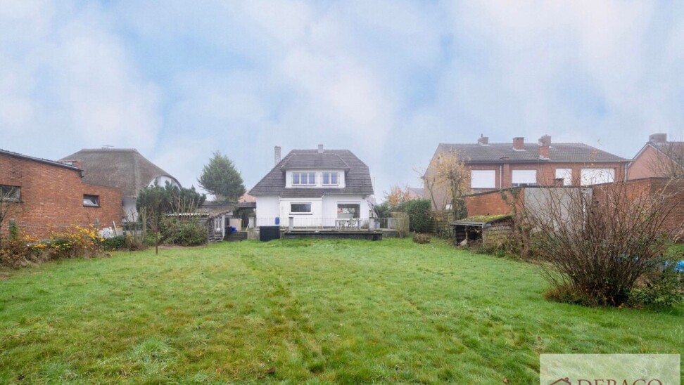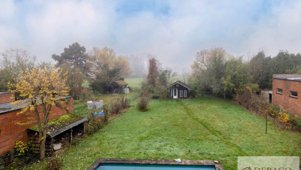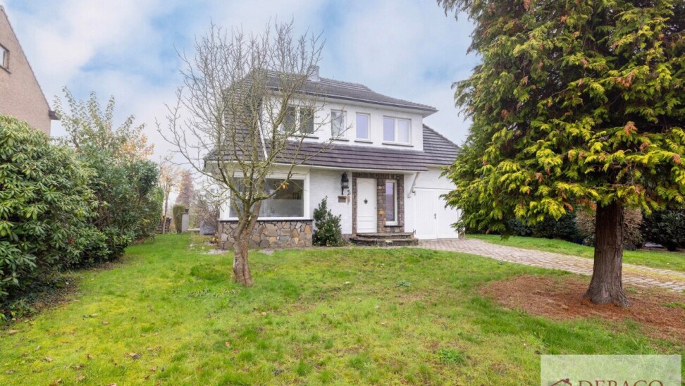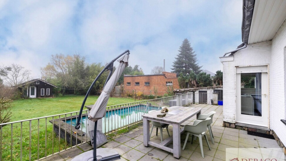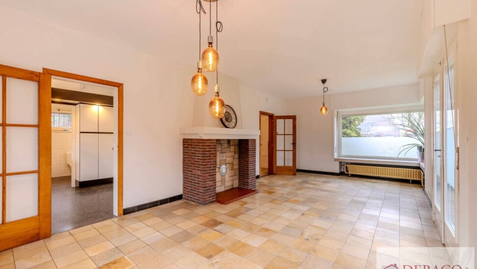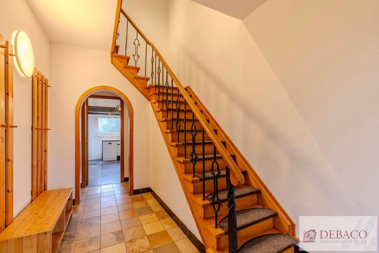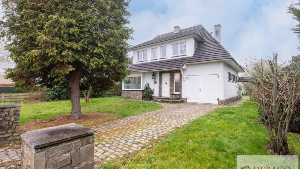 Deze charmante woning bestaat uit een ruime inkomhal, woonkamer, keuken, drie slaapkamers, twee badkamers, kelder, garage, terras en tuin met vijver en tuinhuis.