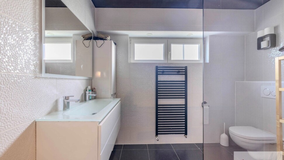 Op de eerste verdieping bevinden zich twee mooie slaapkamers en een prachtige geïnstalleerde badkamer met een ruime inloopdouche, lavabo en toilet.