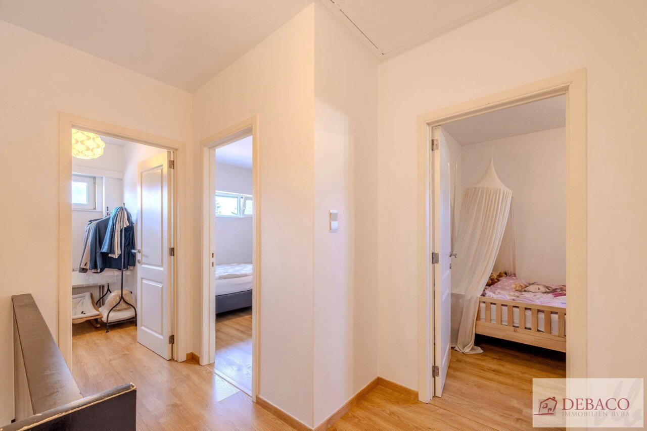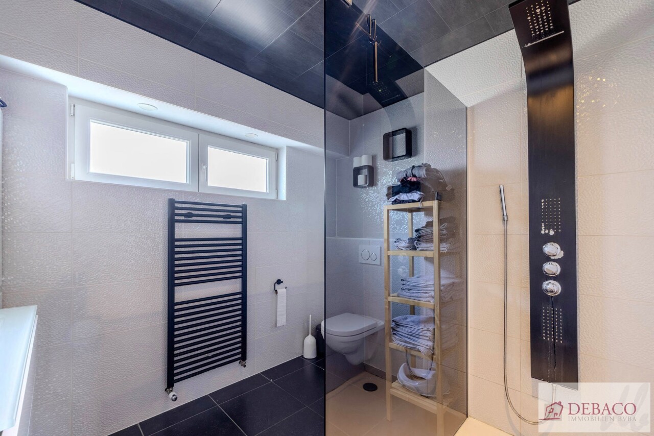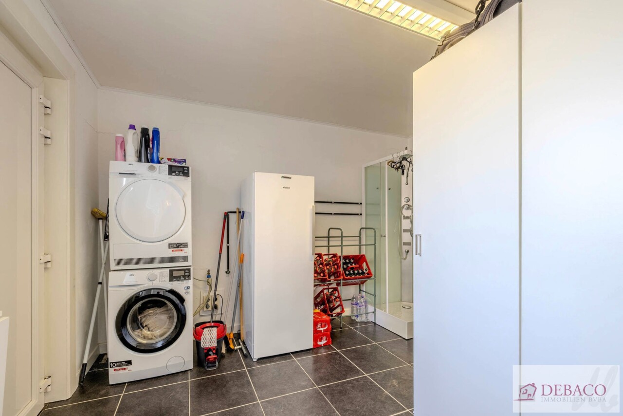 Binnenin wordt u verwelkomd in de inkomhal die uitgeeft op een mooie en aangename leefruimte. Vanuit de leefruimte krijgt u toegang tot de volledig geïnstalleerde keuken. Naast de keuken is er ook nog een zeer praktische bergruimte aanwezig. Verder is er op het gelijkvloers nog een apart gastentoilet, een functionele bureauruimte en een zeer handige wasberging met nog een douchecabine aanwezig.