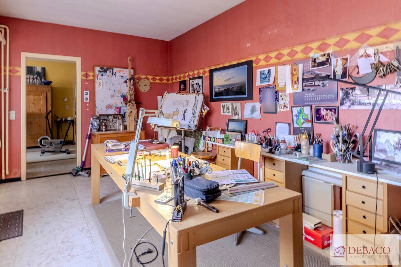 Het achterliggend bijgebouw kan perfect dienen als studio of polyvalente ruimte en bestaat uit een ruime leefruimte, atelier, keuken, badkamer, praktische wasberging, een douche, een slaapkamer en een apart gastentoilet.