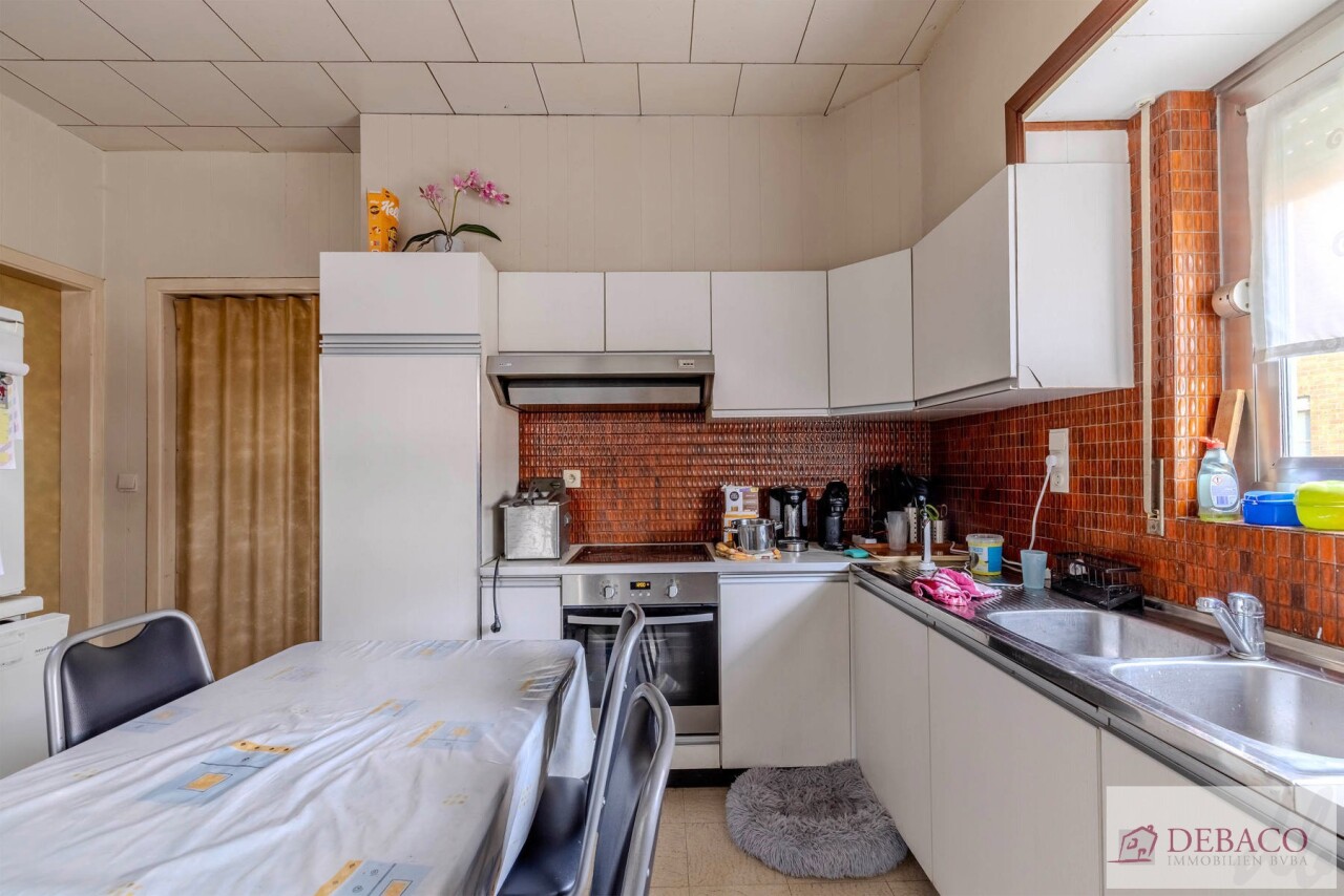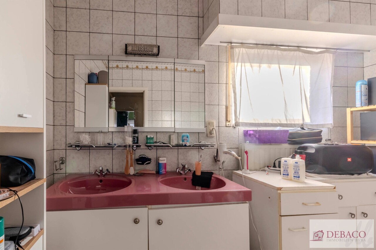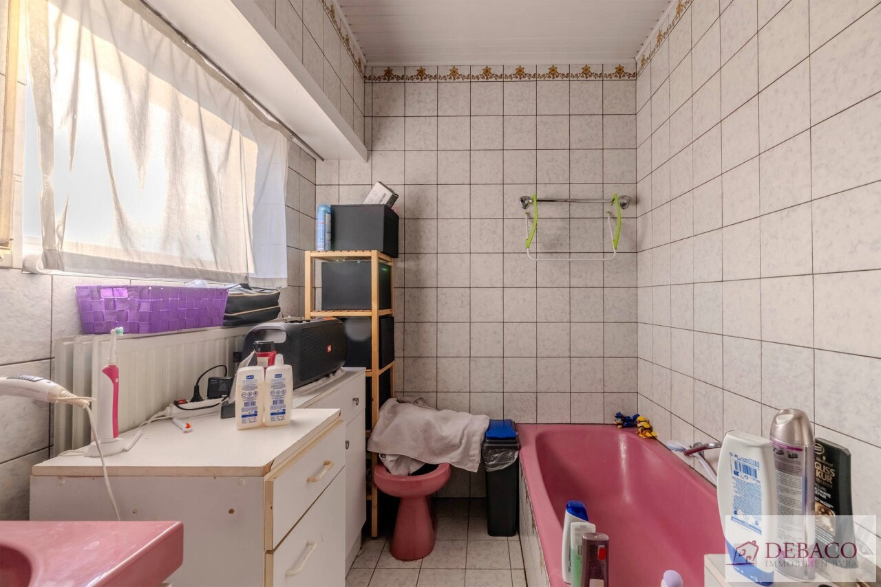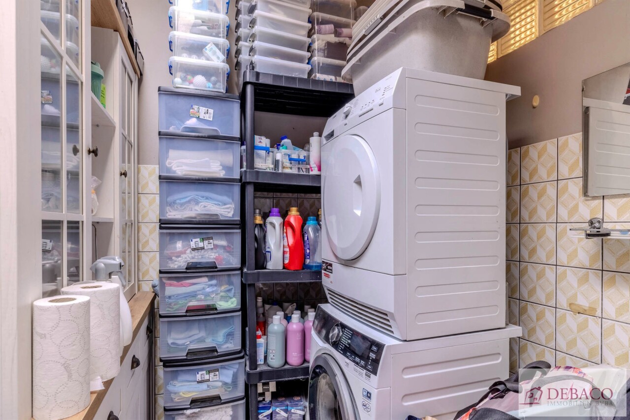 Deze woning bestaat uit een inkomhal die toegang geeft tot de ruime leefruimte met een aansluitende keuken, praktische berging met toegang naar de kelder, een wasruimte met aparte douche en een apart gastentoilet. Vanuit de keuken krijgt u toegang tot de aangename koer. Verder bestaat de woning op de eerste verdieping uit 3 ruime slaapkamers, een kleine berging, een badkamer & een apart toilet.